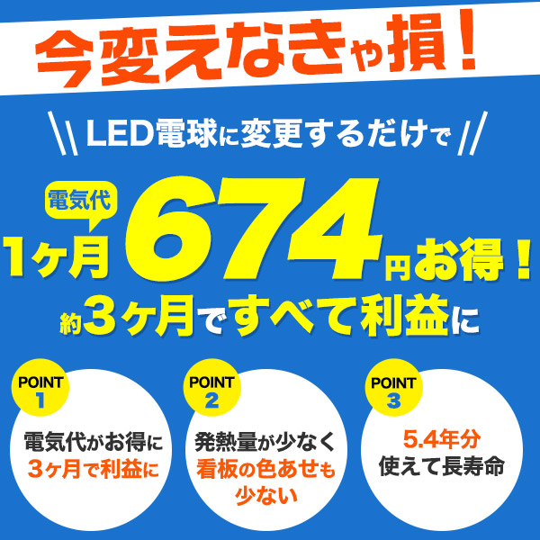 従来の同タイプ100W形ビームランプから変更することで、電気代は1ヶ月で約674円もお得になります。 約3ヶ月で償却でき、それ以降はすべて利益になります。 (1kw=26.4円にて計算)