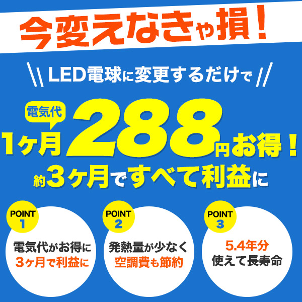 従来の同タイプ40Wミニクリプトン球から変更することで、電気代は1ヶ月で約288円もお得になります。約3ヶ月で償却でき、それ以降はすべて利益になります。(1kw=26.4円にて計算)
