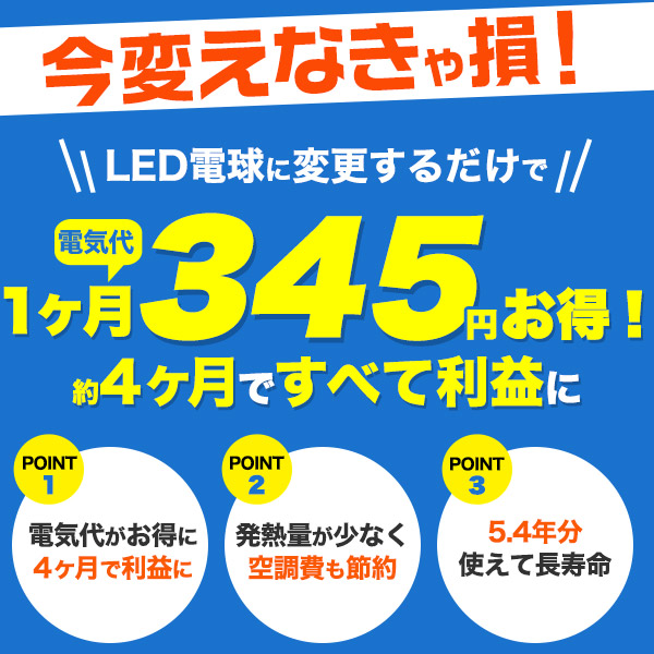 従来の同タイプハロゲン50W形から変更することで、電気代は1ヶ月で約345円もお得になります。 約4ヶ月で償却でき、それ以降はすべて利益になります。 (1kw=26.4円にて計算)