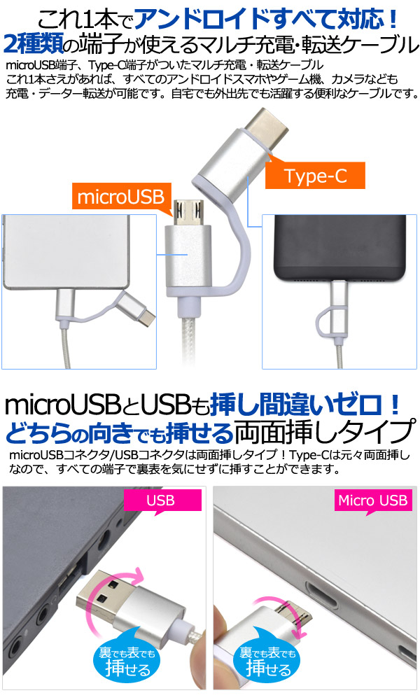 アンドロイド全て対応!両面挿しmicroUSB+Type-C マルチ充電・転送USBケーブル 1m(100cm)<56KΩ抵抗内蔵>