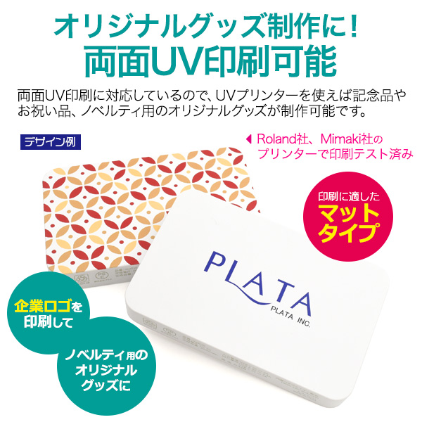 両面UV印刷に対応しているので、UVプリンターを使えば記念品やお祝い品、ノベルティ用のオリジナルグッズが製作可能です。
