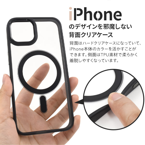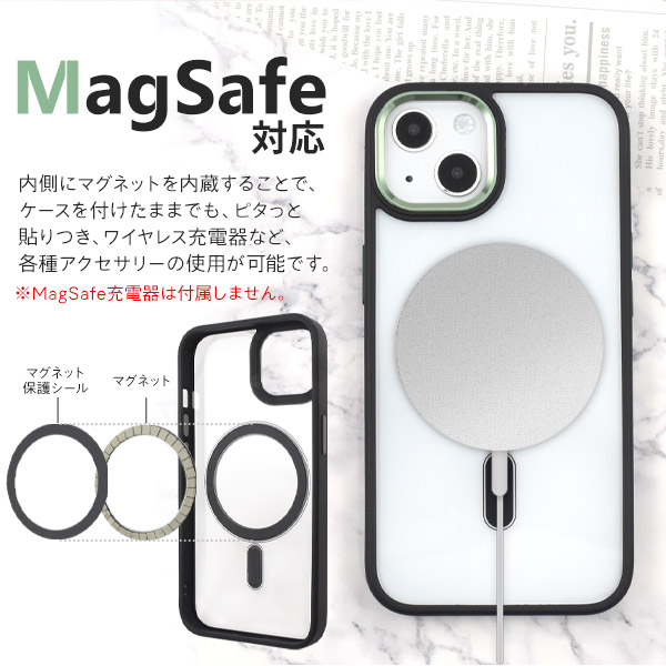 MagSafe対応で、内側にマグネットを内蔵することでケースを付けたままでも、ピタッと貼りつき、ワイヤレス充電など各種アクセサリーの使用が可能です。