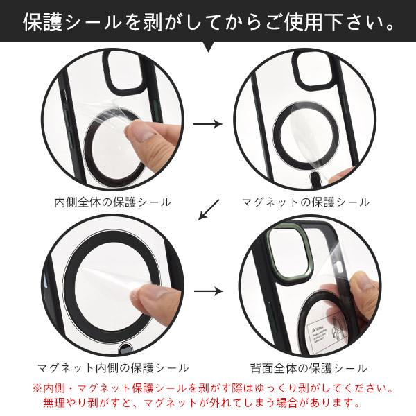 | 注意事項 | ※広角モードで撮影すると、ケースが映り込む場合があります。 ※ライセンス商品ではありません。 ※スマートフォンは付属しません。 ※MagSafe充電器は付属しません。 ※本製品は強い衝撃からスマートフォンを保護することは出来ません。 ※4カ所に保護シートが貼ってありますので、剥がしてご使用ください。内側・マグネット保護シールを剥がす際はゆっくり剥がしてください。無理やり剥がすとマグネットが外れてしまう場合があります。 ※画像の色調はご使用のモニターの機種や設定により実際の商品と異なる場合があります。 |
