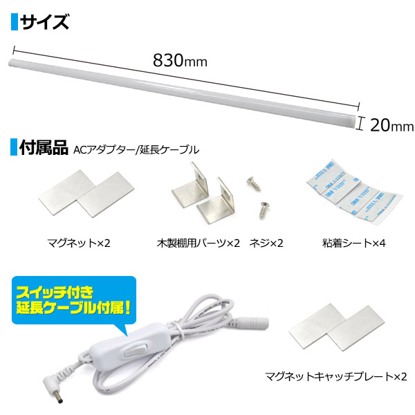 | サイズ | 入力電圧 100V 50/60Hz 出力電圧 DC12V 消費電力 10W 色温度 白色:6000K 電球色:2700K 全光束 白色:1010lm 電球色:930lm サイズ(約) 長さ830×縦15×横15×発光面20mm 重量(約) 124g |