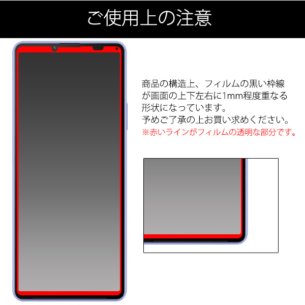 | 注意事項 | ★Xperia 10 IIIも共通で使用可能ですので、ページ全体更新しました。<2022.8.24> ★本体が湾曲しているため、本商品は上下左右が小さめの形状でカットされています。 ※スマートフォン本体は付属しません。