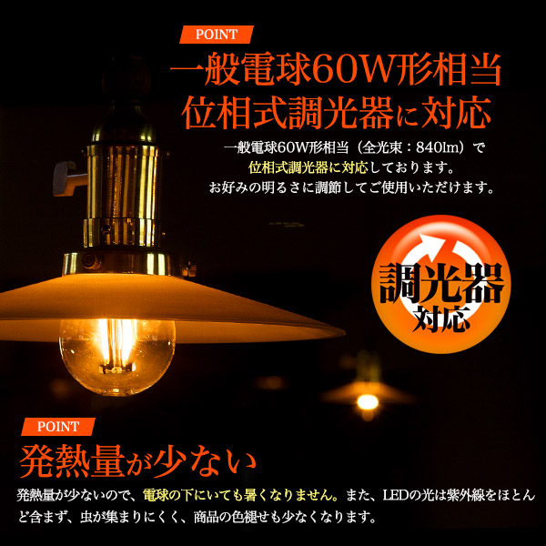 フィラメント型のLEDが輝き、ペンダントライトやシーリングライト、スタンドライト、インテリア用照明器具等、幅広いシーンでレトロな雰囲気を演出します。