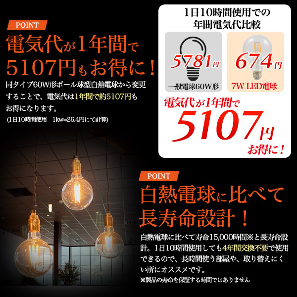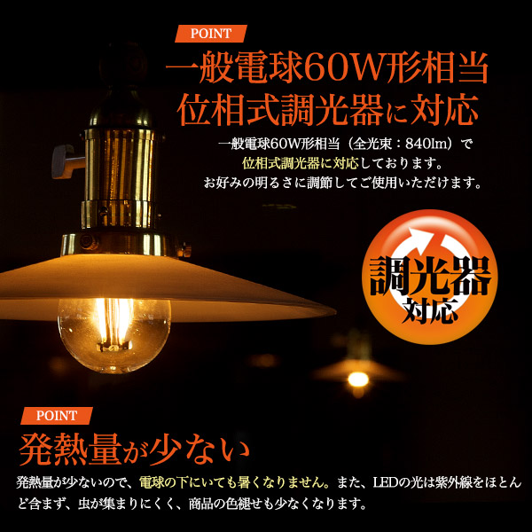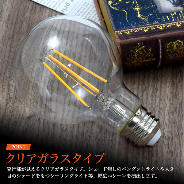 フィラメント型のLEDが輝き、幅広いシーンでレトロな雰囲気を演出します。シェード無しのペンダントライトや大き目のシェードをもつシーリングライト、スタンドライトに最適です。