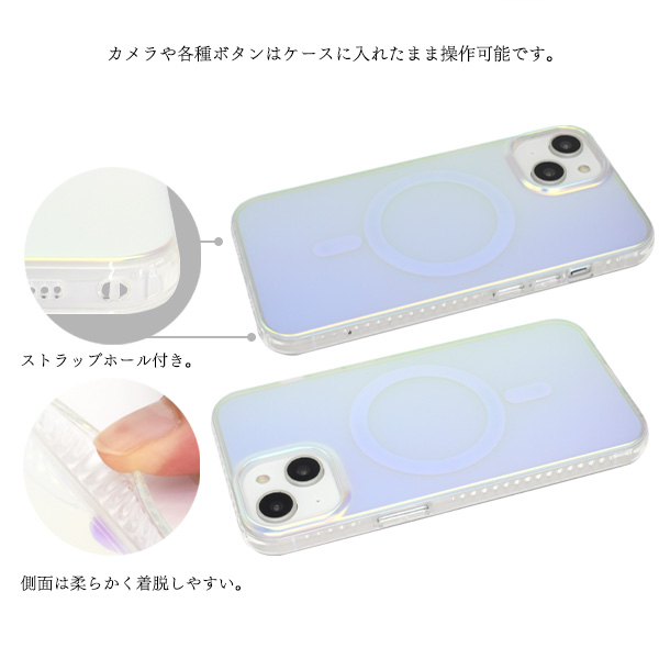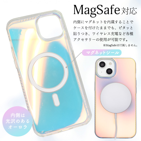 | 注意事項 | ★オーロラカラーには個体差があります。 ※iPhoneは付属しません。 ※MagSafe充電器は付属しません。 ※本製品は強い衝撃からiPhoneを保護することは出来ません。 ※広角モードで撮影すると、ケースが映り込む場合があります。 ※マグネットシールは剥がさずご使用下さい。 ※画像の色調はご使用のモニターの機種や設定により実際の商品と異なる場合があります。 ※ライセンス商品ではありません。 |