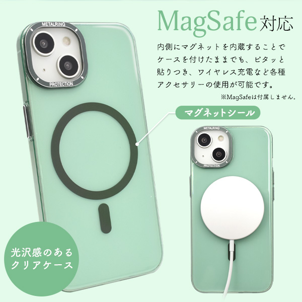 MagSafe対応で、内側にマグネットを内蔵することでケースを付けたままでも、ピタッと貼りつき、ワイヤレス充電など各種アクセサリーの使用が可能です。