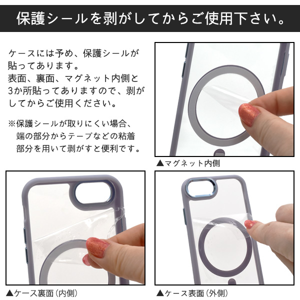 | 注意事項 | ★Phone 7はワイヤレス充電非対応機種です。ケースの装着は可能ですが、MagSafeでの充電はできません。 ★広角モードで撮影すると、ケースが映り込む場合があります。 ※画像の色調はご使用のモニターの機種や設定により実際の商品と異なる場合があります。 ※ライセンス商品ではありません。 ※スマートフォン、MagSafe充電器、ストラップ、その他撮影用小物等は付属しません。 ※本製品は強い衝撃からスマートフォンを保護することは出来ません。 ※マグネットシールは剥がさずご使用下さい。 |
