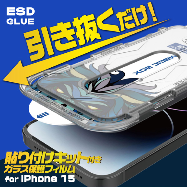 誰でも簡単!ワンタッチ貼り付け! iPhone 15用 貼り付けキット付きガラスフィルム