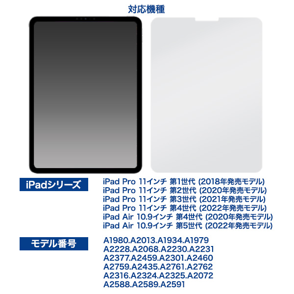 | サイズ | 対応機種 iPad Pro 11インチ 第1世代 (2018年発売モデル) iPad Pro 11インチ 第2世代 (2020年発売モデル) iPad Pro 11インチ 第3世代 (2021年発売モデル) iPad Pro 11インチ 第4世代 (2022年発売モデル) iPad Air 10.9インチ 第4世代 (2020年発売モデル) iPad Air 10.9インチ 第5世代 (2022年発売モデル) モデル番号 A1980.A2013.A1934.A1979 A2228.A2068.A2230.A2231 A2377.A2459.A2301.A2460 A2759.A2435.A2761.A2762 A2316.A2324.A2325.A2072 A2588.A2589.A2591 付属品 貼り付けキット+ガラスフィルムセット×1/クリーナーセット×1 |