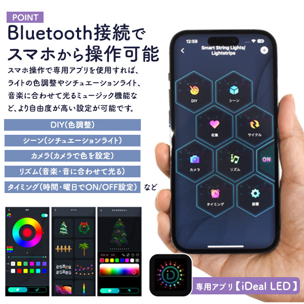スマホ操作で専用アプリを使用すれば、ライトの色調整やシチュエーションライト、