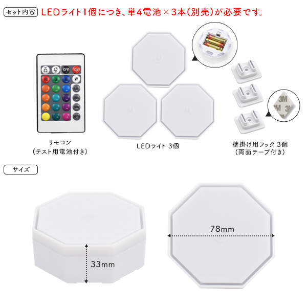 | サイズ | サイズ(約) 高さ33×幅78mm 重さ(約) 50g ※1個の重さです。 付属品 リモコン/壁掛け用フック×3 電源 本体:ライト1個につき 単4電池×3本(別売) リモコン:ボタン型リチウム電池CR2025(テスト用電池付属) 電力 1w リモコン操作範囲 5-8m |