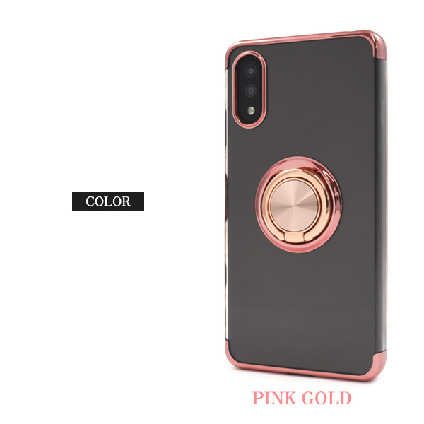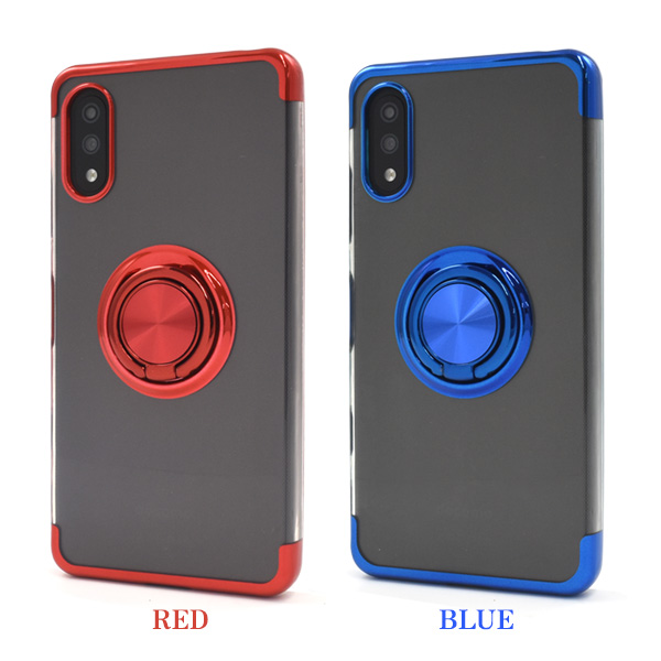 落下防止用のスマホリングが付いた、メタルカラーバンパーソフトクリアケースです。