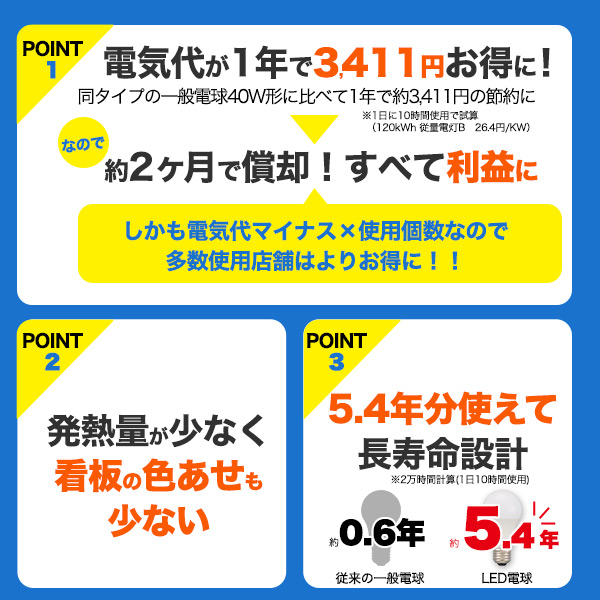 従来の同タイプ40W形一般電球から変更することで、電気代は1年で約3411円もお得になります。 約2ヶ月弱で償却でき、それ以降はすべて利益になります。 (1kw=26.4円にて計算)