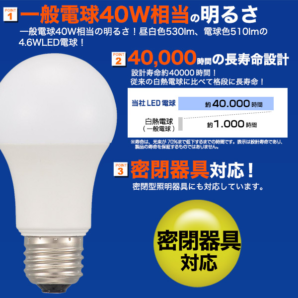 一般電球40W形相当の明るさ!昼白色530lm、電球色510lmの4.6WLED電球!