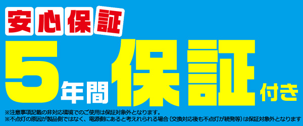 | 注意事項 | 【保証について】 保証期間:お買い上げ日より5年 ※注意事項記載の非対応環境でのご使用は保証対象外となります。 ※不点灯の原因が製品側ではなく、電源側にあると考えれられる場合 (交換対応後も不点灯が続発する等)は保証対象外となります。 【ご注意】 ※次のような器具には使用できません。 ・調光機能のついた器具(100%点灯でも使用不可) ・誘導灯、非常用照明器具 ・HIDランプ器具、水銀灯器具 ・直流電源 ※このほか使用器具の種類によって寸法的、熱的、その他の状況(リモコン機器のついた器具など)により使用できない場合があります。 ※ご使用になられる照明器具の構造によっては、放熱不良で短寿命となることがあります。 ※密閉器具でのご使用の場合、器具の寸法により、使用できない場合や寿命が短くなる場合があります。 |