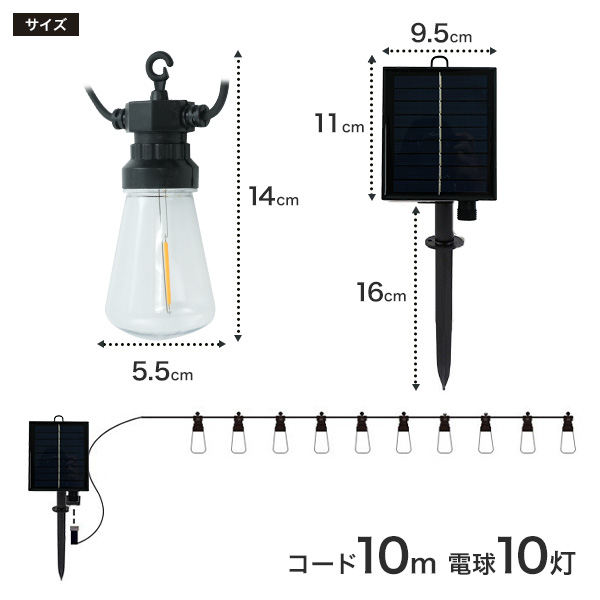 | サイズ | サイズ(約) 電球:直径5.5×高さ14cm ソーラーパネル:横9.5×厚み2.5×高さ11cm コード:10m 重量(約) 650g セット内容 ソーラーパネル/ソーラーパネルのスタンド/ソーラーパネルの取り付け用ネジ(壁付け用)/電球(10灯) |