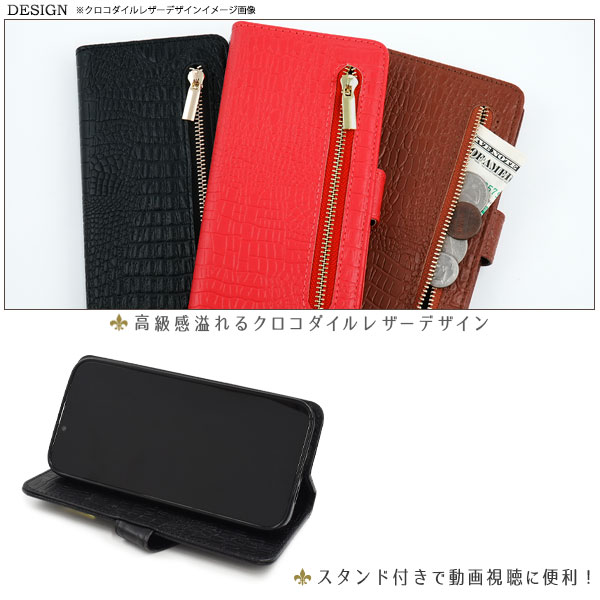 クロコダイルレザーデザインの手帳型ケース。