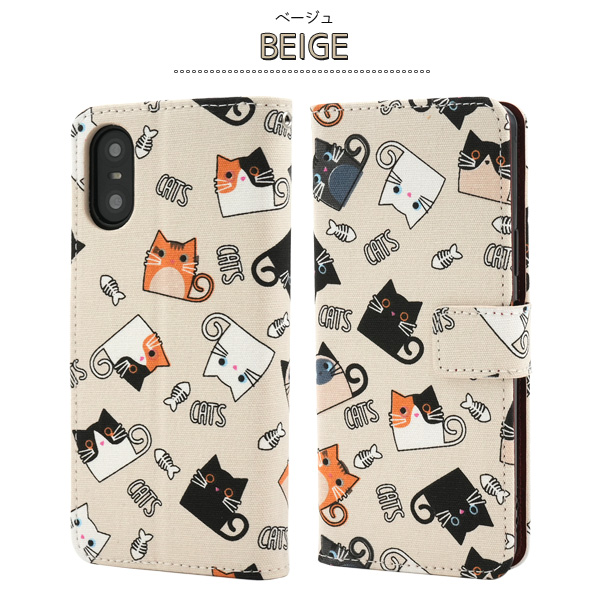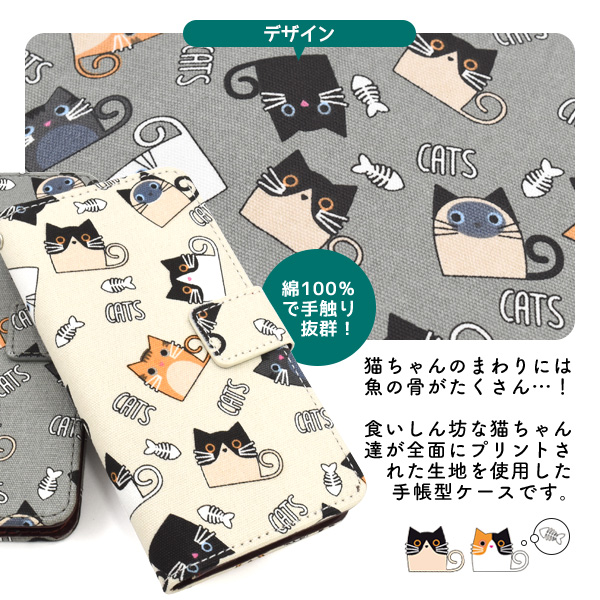 食いしん坊な猫ちゃん達を全面にプリントした生地を使用した手帳型ケースです。