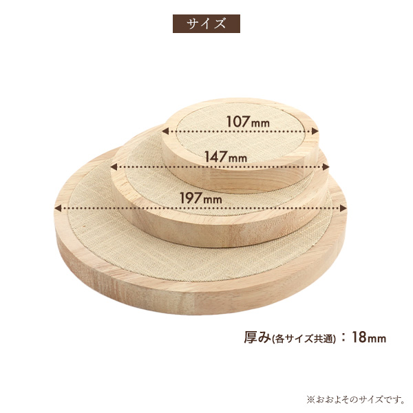 | サイズ | サイズ(約) 大:直径197mm 厚み:18mm 中:直径147mm 厚み:18mm 小:直径107mm 厚み:18mm 重さ(約) 大:167g 中:103g 小:66g |