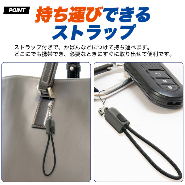 ストラップ付きで、かばんなどにつけて持ち運べます。どこにでも携帯でき、必要なときにすぐに取り出せて便利です。