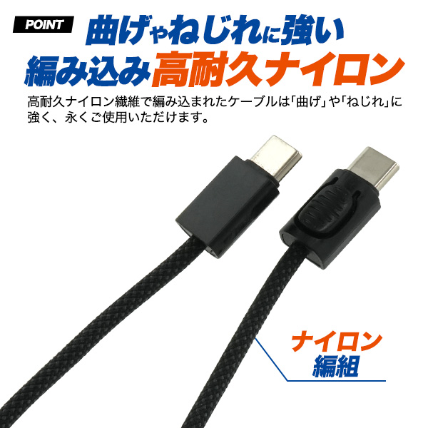 高耐久ナイロン繊維で編み込まれたケーブルは「曲げ」や「ねじれ」に強く、永くご使用いただけます。