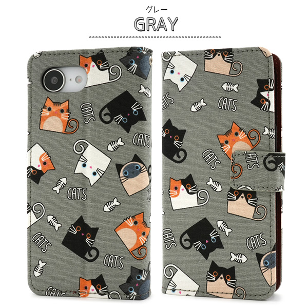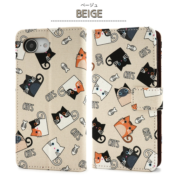 食いしん坊な猫ちゃん達を全面にプリントした生地を使用した手帳型ケースです。