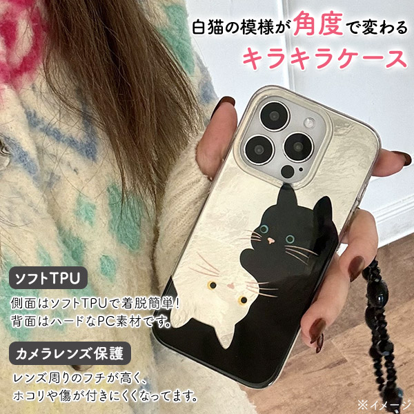 白猫の模様が角度で変わるキラキラとしたケースです。