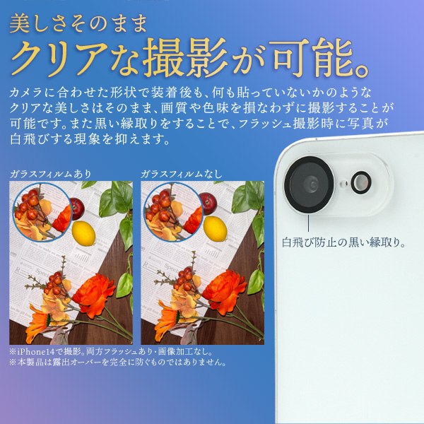 | 注意事項 | ※iPhone本体は付属しません。 ※ライセンス商品ではございません。 ※画像はイメージです。 ※仕様は予告なく変更する場合があります。 ※フィルムをパッケージの台紙から剥がす際・貼り直しの際はゆっくり剥がしてください。急いで剥がしますと割れる原因になります。 ※本製品は露出オーバーを完全に防ぐものではありません。 ※防水ケースなど、カメラ部分が覆われている一部のケースでは干渉する場合があります。 ※iPhoneケースを付けず使用すると、フィルムが剥がれやすくなる場合があります。 |