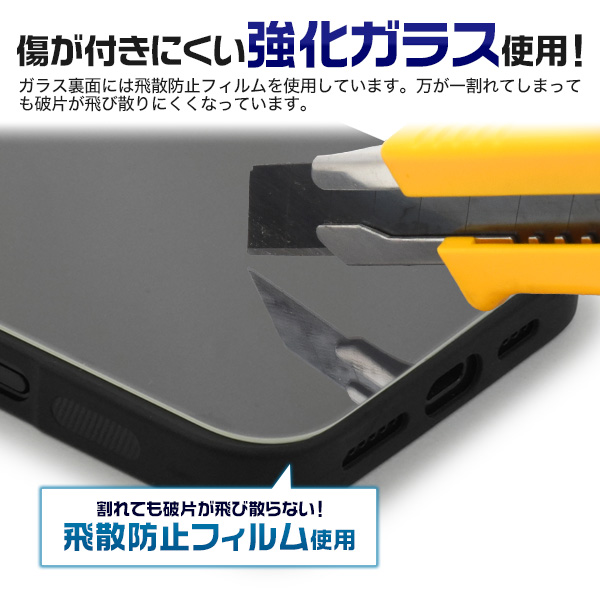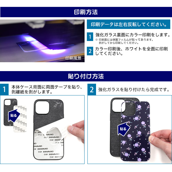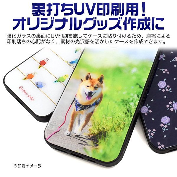 強化ガラスの裏面に反転したデータを印刷し、印刷面をケースに貼り付けるため、摩擦による印刷落ちの心配がなく、素材の光沢感を活かせるケースです。