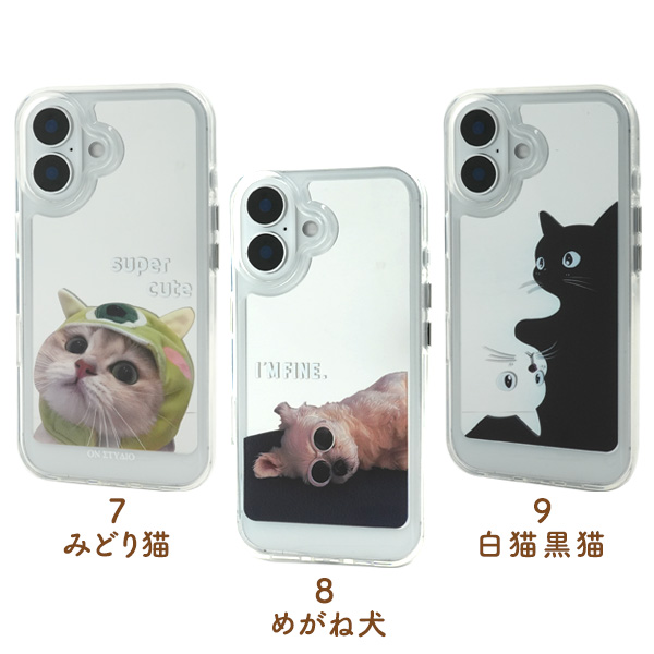 | サイズ | 対応機種 iPhone 16 種類 1.柴犬/2.マルチーズ/3.あくび犬/4.あくび猫/5.おんぶ猫/6.ピンク猫/7.みどり猫/8.めがね犬/9.白猫黒猫 サイズ(約) 縦150×横76×厚み13mm 重さ(約) 30g |