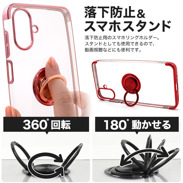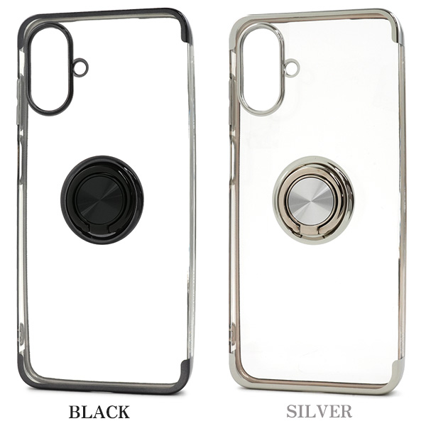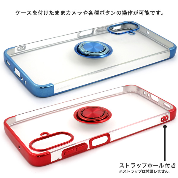 落下防止用のスマホリングが付いた、メタルカラーバンパーソフトクリアケースです。