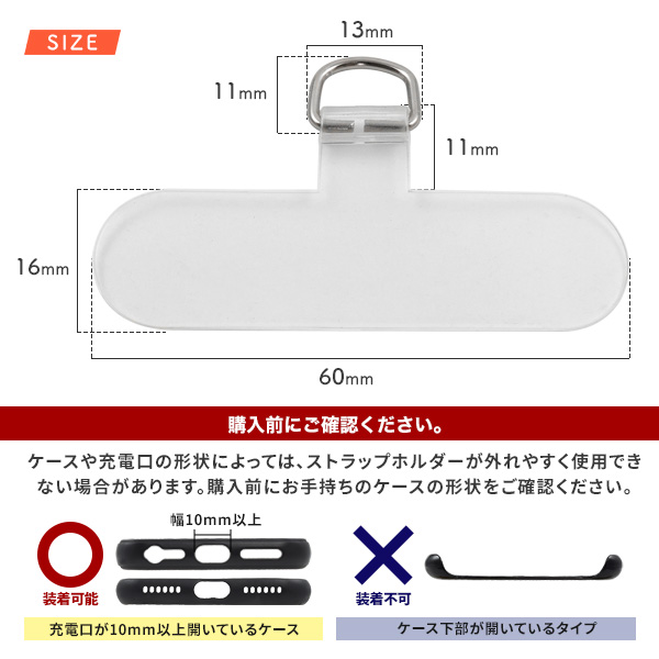 | 注意事項 | ★素材パーツの為、パッケージ、取説等はございません。 ※ストラップ類、スマホ、スマホケースは付属しません。 ※スマートフォンケース専用です。 ※本来の目的以外でのご使用はおやめください。事故や破損の原因になります。 ※ケースによってはストラップホルダーを装着したままケーブル充電ができない場合があります。 |