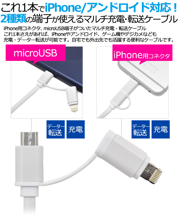 これ1本でiPhone/アンドロイド対応!通信&充電に。 2in1マルチ充電・転送USBケーブル