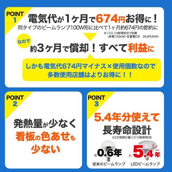 従来の同タイプ100W形ビームランプから変更することで、電気代は1ヶ月で約674円もお得になります。 約3ヶ月で償却でき、それ以降はすべて利益になります。 (1kw=26.4円にて計算)