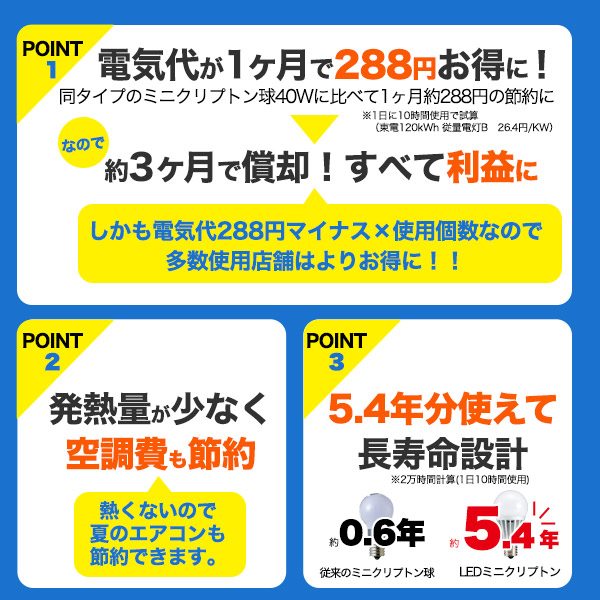 従来の同タイプ40Wミニクリプトン球から変更することで、電気代は1ヶ月で約288円もお得になります。約3ヶ月で償却でき、それ以降はすべて利益になります。(1kw=26.4円にて計算)