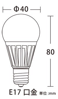 | サイズ | 口金 E17 全長 (約)80mm 最大径 (約)40mm 重量 (約)41g 消費電力 4W 色温度 電球色相当 全光束 500lm 平均演色評価数 Ra80 照射角度 230° 入力電圧 AC100V 50/60Hz |