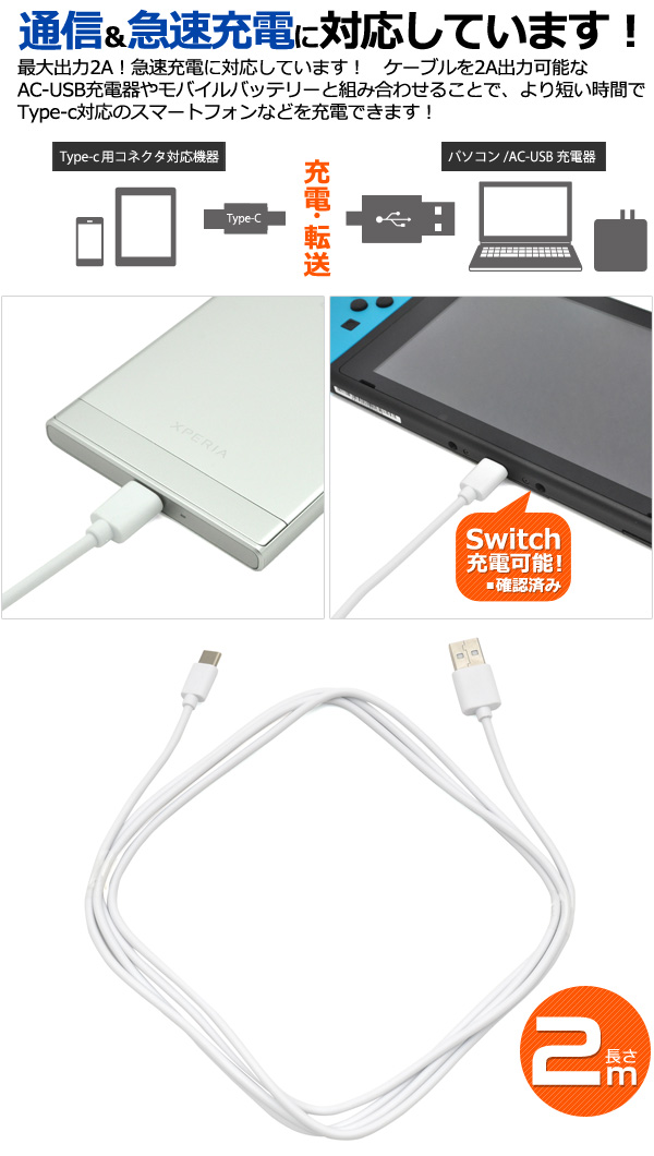 Type-C搭載スマホのデーター通信&充電に最適な、USB Type-Cケーブル 2m