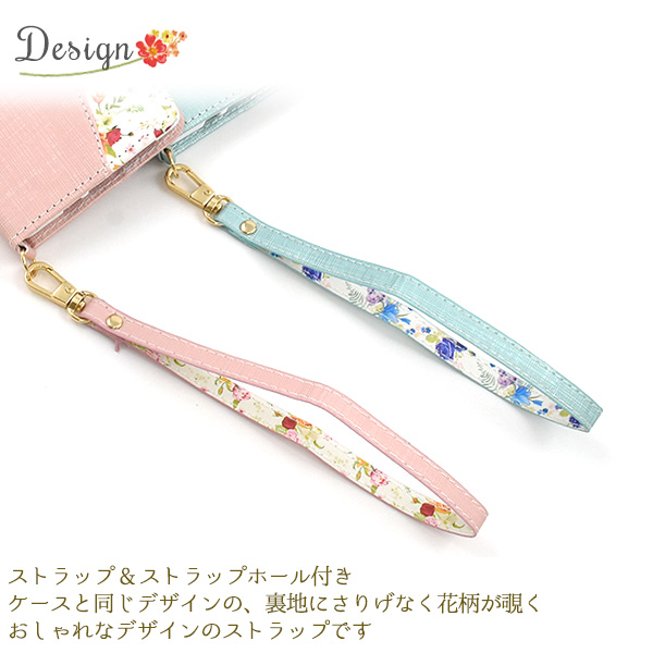 ケースと同色の、裏地にさりげなく花柄が覗くおしゃれなデザインのストラップです。