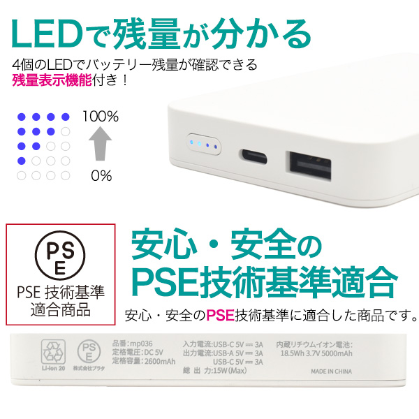 | 注意事項 | ※ライセンス商品ではありません。 ※スマートフォンは付属しません。 ※長期保存の場合は満充電を避けてください。 ※使用後は本体から接続ケーブルを外して下さい。 ※本製品の蓄電とスマホの充電は同時に行えません。 |