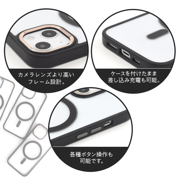 MagSafe対応で、内側にマグネットを内蔵することでケースを付けたままでも、ピタッと貼りつき、ワイヤレス充電など各種アクセサリーの使用が可能です。