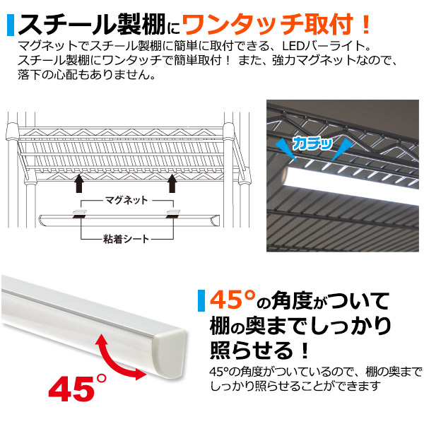 マグネットでスチール製棚に簡単に取付できるLEDバーライト。 スチール製棚にワンタッチで簡単取付! また、強力マグネットなので、 落下の心配もありません。
