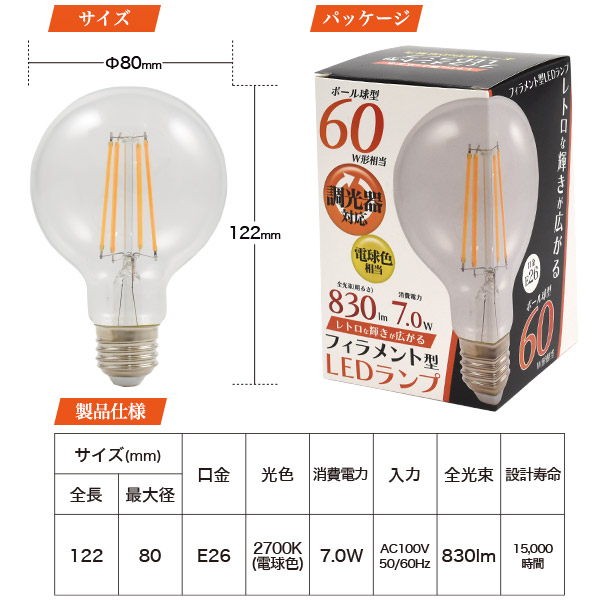 | サイズ | 口金 E26 全長 (約)122mm 最大径 (約)80mm 重量 (約)38g 消費電力 7.0W 入力 AC100V 50/60Hz 色温度 2700K(電球色) 全光束 830lm |