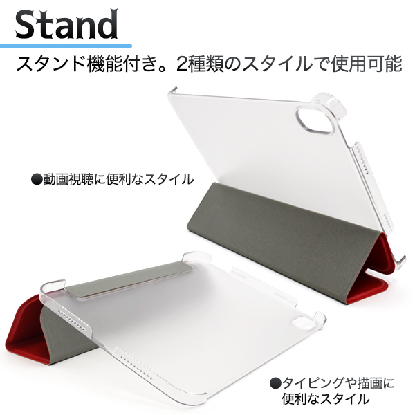 カバーを折り返すとスタンドとして使用できます。2種類の角度で使用できるので、動画視聴はもちろん、タイピングや描画の際にも便利です。