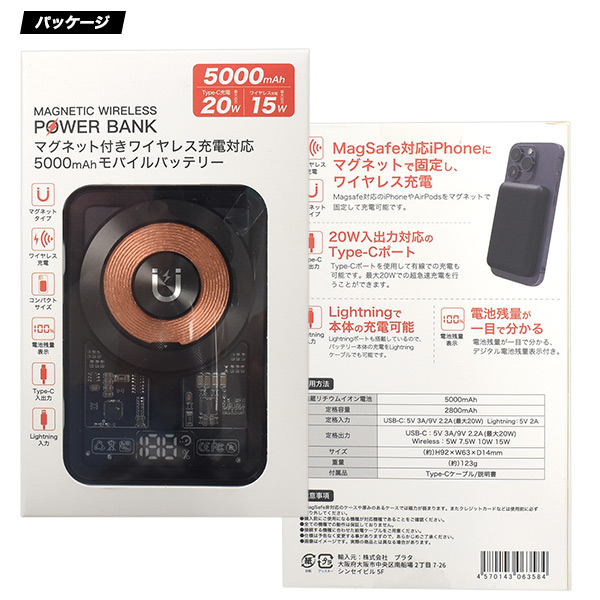 | 注意事項 | ※iPhone等は付属しません。(Type-Cケーブルのみ付属) ※長期保存の場合は満充電を避けてください。 ※すべての機種への充電を保証するするものではありません。ご使用の機種によっては充電できない場合があります。 ※本製品は一般家庭用です。業務用または一般家庭用以外では使用しないでください。 ※iPhoneやAirPodsにケースを装着した状態での充電は、充電効率が落ちたり充電できないことがあります。その場合はケースを取り外して背面に何もない状態でご使用ください。 ※充電できない場合があるので、厚みがあるケース、背面が平らでないケース、スマホリング、金属製や磁気を帯びたケース使用前に取り外してください。 ※本製品は磁石を使用しています。磁気カード(クレジットカードなど)を近づけないでください。 ※マグネットでの固定はMagSafe対応機種のみです。ケースを外した状態かMagSafe対応のケースを装着した状態でお使いください。 ※レザーケースなど、ご利用のケースによってはケースに型押ししたような跡が残る場合があります。これは異常ではありませんが、気になる場合はケースを外して充電してください。 ※同時充電の場合、Type-C充電が優先され、ワイヤレス充電は遅くなります。 ※付属ケーブルはモバイルバッテリー専用ケーブルです。 |