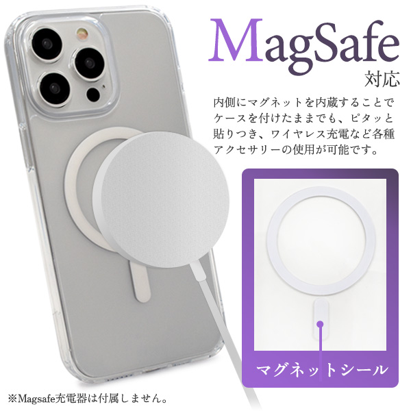 MagSafe対応で、内側にマグネットを内蔵することでケースを付けたままでも、ピタッと貼りつき、ワイヤレス充電など各種アクセサリーの使用が可能です。