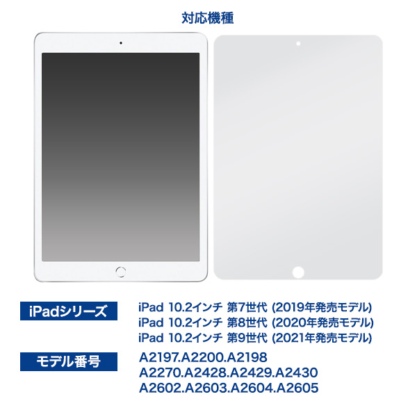 | サイズ | 対応機種 iPad 10.2インチ 第7世代 (2019年発売モデル) iPad 10.2インチ 第8世代 (2020年発売モデル) iPad 10.2インチ 第9世代 (2021年発売モデル) モデル番号 A2197.A2200.A2198 A2270.A2428.A2429.A2430 A2602.A2603.A2604.A2605 付属品 貼り付けキット+ガラスフィルムセット×1/クリーナーセット×1 |