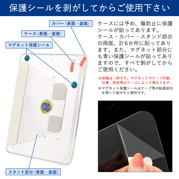| 注意事項 | ※ライセンス商品ではありません。 ※本製品は強い衝撃からタブレットを保護することは出来ません。 ※広角モードで撮影すると、ケースが映り込む場合があります。 ※ケースには予め保護シールが貼ってあります。ケース(表面・裏面)、カバー(表面・裏面)、スタンド部分(表面・裏面)に貼ってあります。また、マグネット部分にも青い保護シールが貼ってあります。すべて剝がしてからご使用ください。 ※画像の色調はご使用のモニターの機種や設定により実際の商品と異なる場合があります。 |